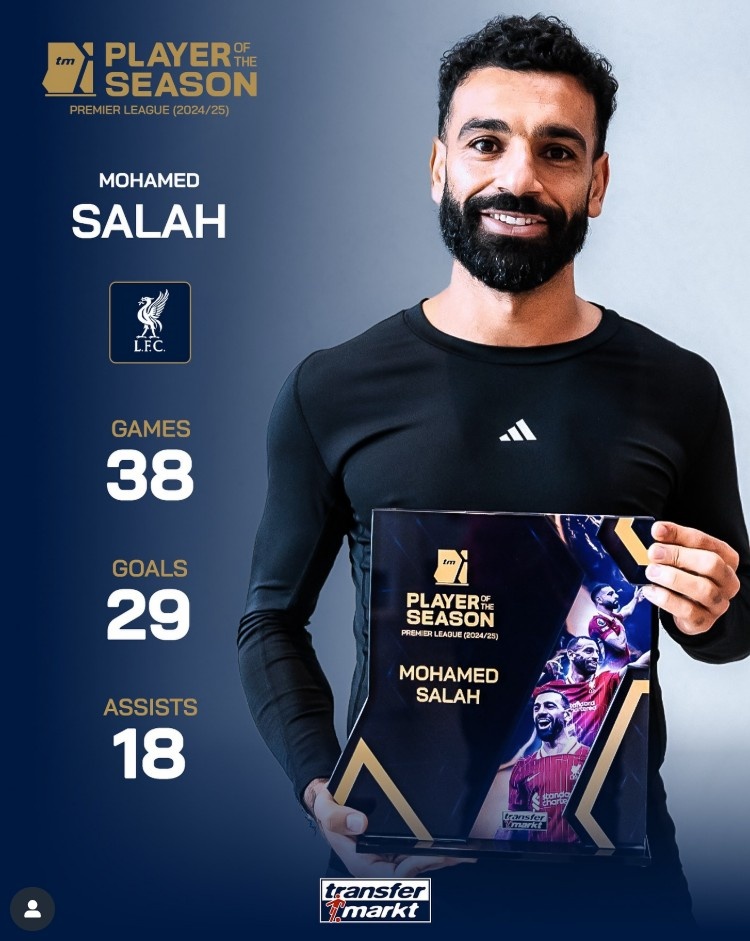 29球18助,萨拉赫领取德转颁发的上赛季英超最佳球员奖杯